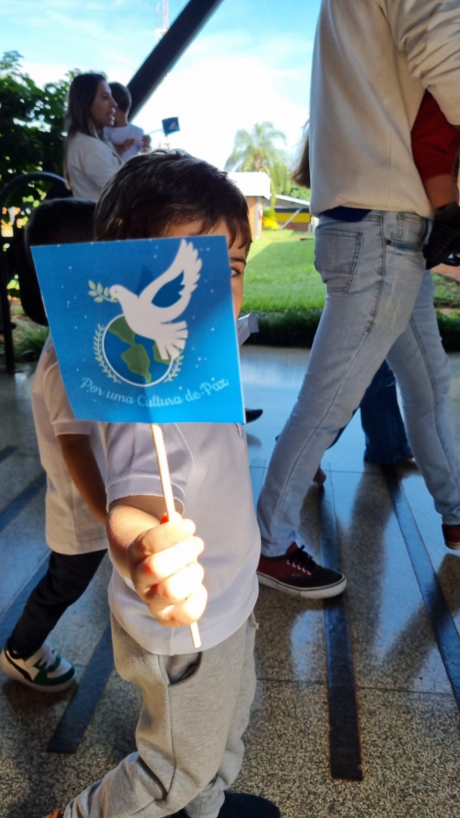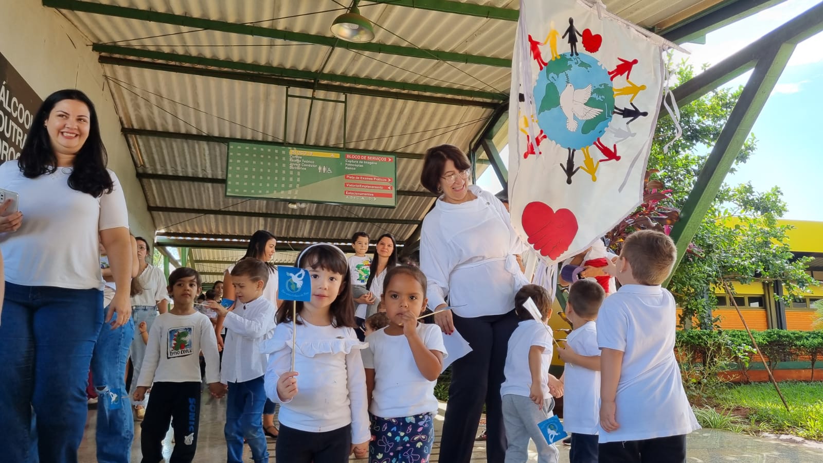 A música A Paz da banda Roupa Nova foi a trilha sonora da caminhada promovida pelo CEI Claudete de Oliveira da Vera Cruz - CEI Detran nesta quarta-feira (10). Acompanhadas dos educadores e vestindo roupas brancas, as crianças seguravam plaquinhas com imagem de uma pomba branca em cima do globo terrestre e a frase “Por uma cultura de paz”.