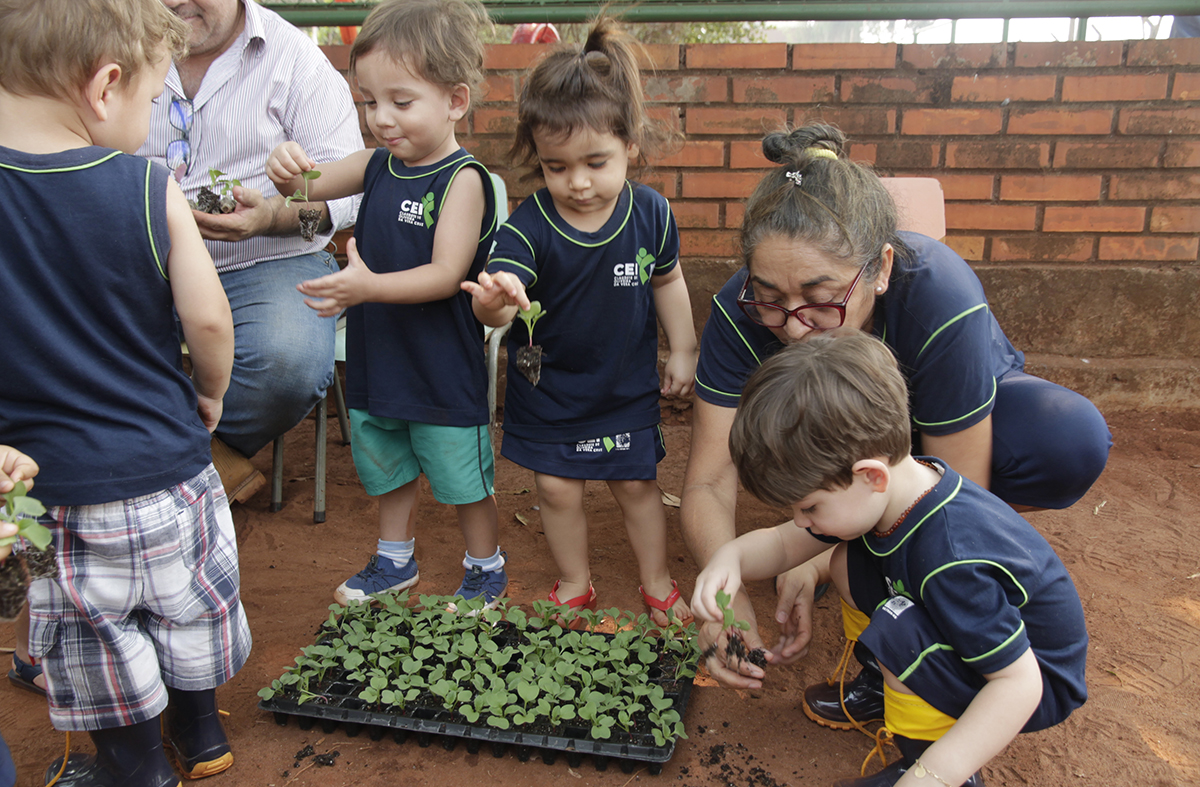 Crianças plantam primeiras mudas na horta do CEI Detran
