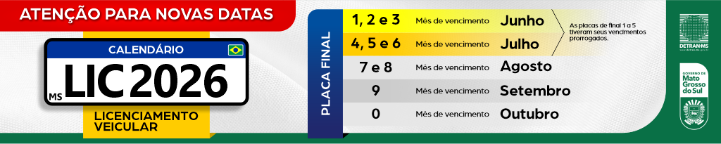 • O Departamento Estadual de Trânsito de Mato Grosso do Sul (Detran-MS) publicou, na edição desta segunda-feira (13) do Diário Oficial do Estado, a Portaria nº 209/2026, que altera o calendário anual de licenciamento de veículos para o exercício de 2026.