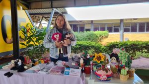 Rosana Ojeda, servidora da Agência dos Despachantes, estava com a banca de artesanatos. “Gosto de costurar, então tudo que tenho aqui é referente a costura. Boneca de pano, kit de toalhinha com sachê, pano de prato, bolsinha, peso de porta. É o que eu faço nas horas vagas. Os colegas conhecem a gente, conhecem nosso trabalho, e eles prestigiam bastante, por isso a feirinha é muito boa”.