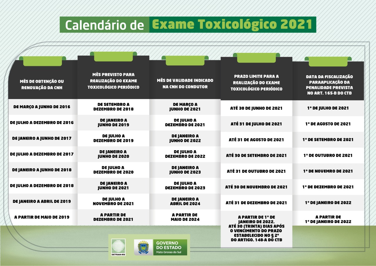Confira a lista contendo os prazos para início das fiscalizações, de acordo com o período da emissão da última CNH, para que os motoristas se atentem ao prazo limite para realização do toxicológico intermediário: