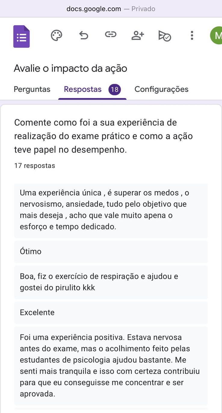 Entre as avaliações do questionário de avaliação também constam registros de candidatos que agradeceram e dividiram a alegria da aprovação. “Foi uma experiência positiva. Estava nervosa antes do exame mas o acolhimento feito pelas estudantes de psicologia ajudou bastante. Me senti mais tranquila e isso com certeza contribuiu para que eu conseguisse me concentrar e ser aprovada”.