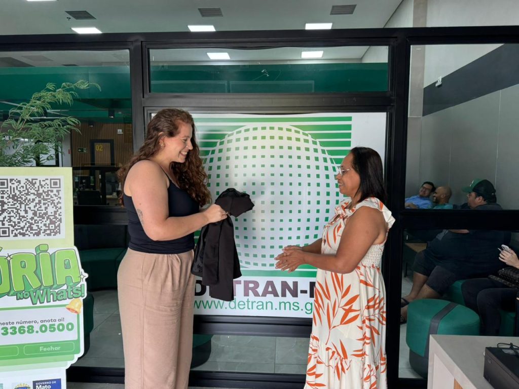 Servidora do Detran-MS ajuda mulheres durante renovação da CNH com o blazer preto da empatia